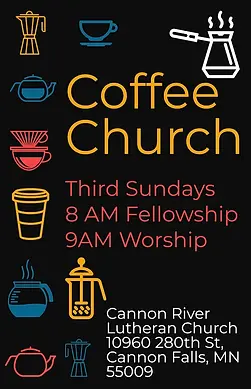 Coffee Church: Coffee and goodies start at 8 am followed by an informal and interactive service at 9am in the Fellowship Hall